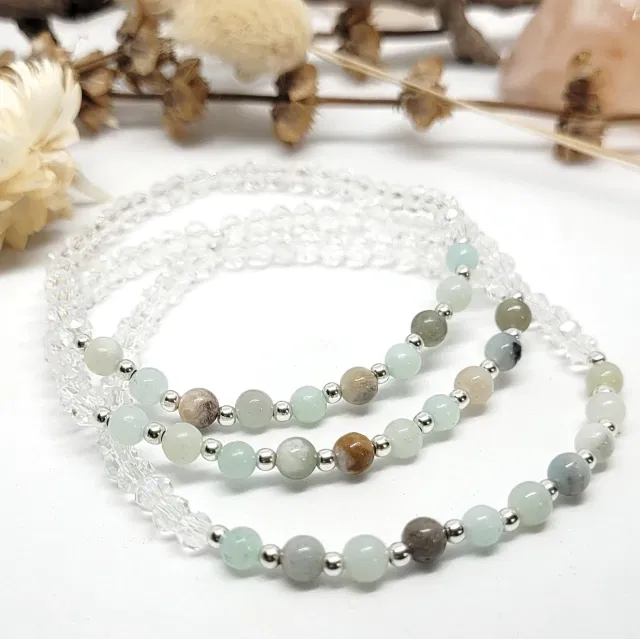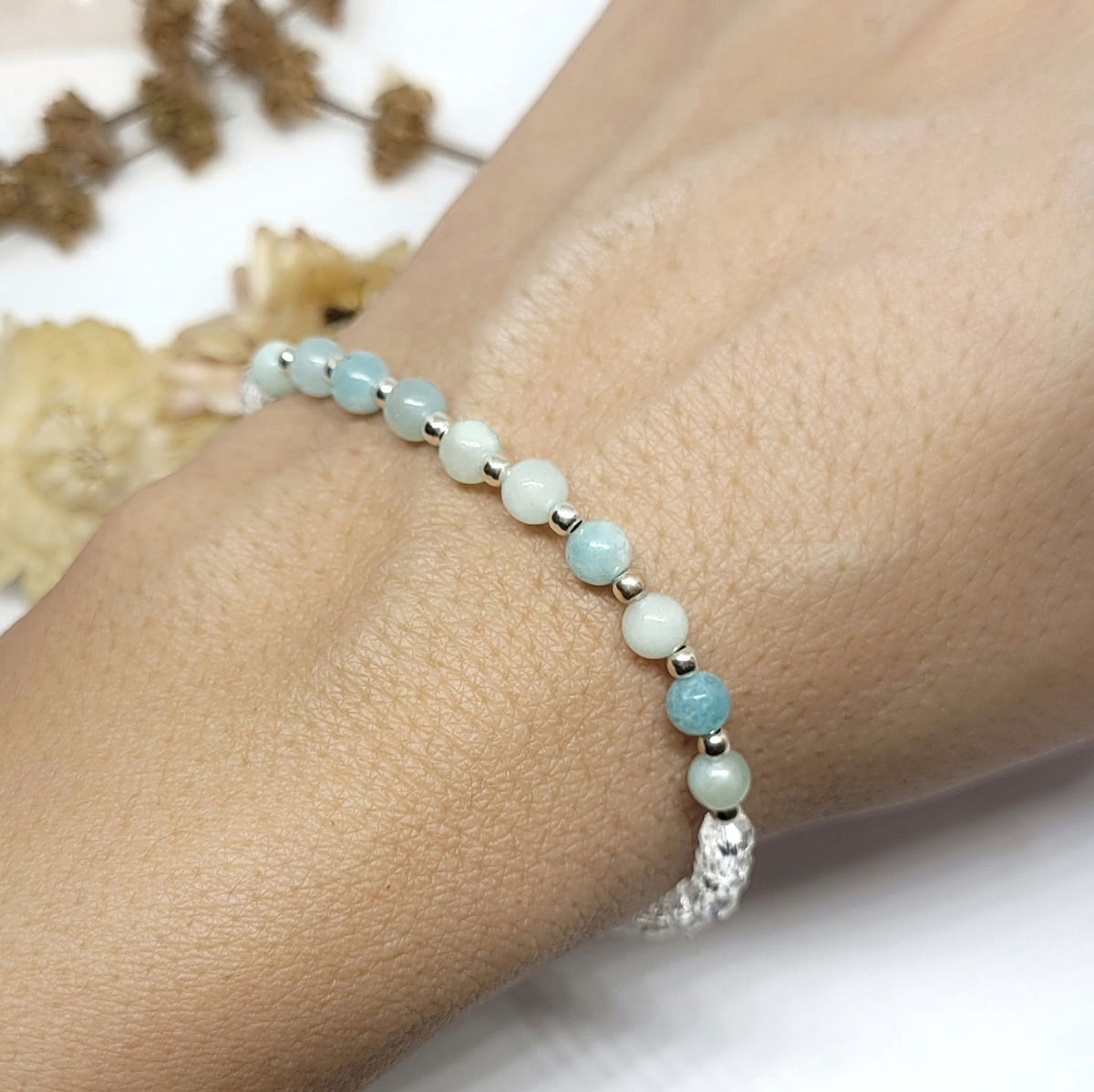 La pulsera Vera está hecha a mano con amazonita natural, cuentas de plata y cristal. Es elastizada, cómoda y se adapta fácilmente a tu muñeca.