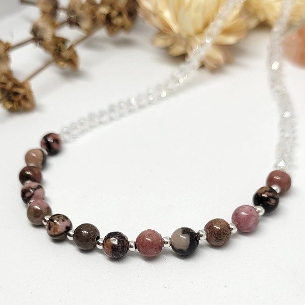 💫Choker con piedra rodonita natural de 6mm, cuentas de plata y cristal
