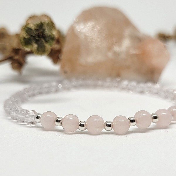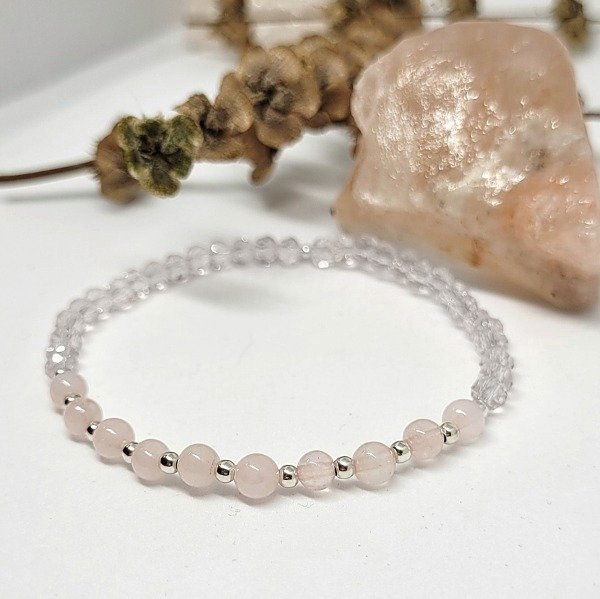 La pulsera Dana está hecha a mano con cuarzo rosa natural, cuentas de plata y cristal. Es elastizada, cómoda y se adapta fácilmente a tu muñeca.