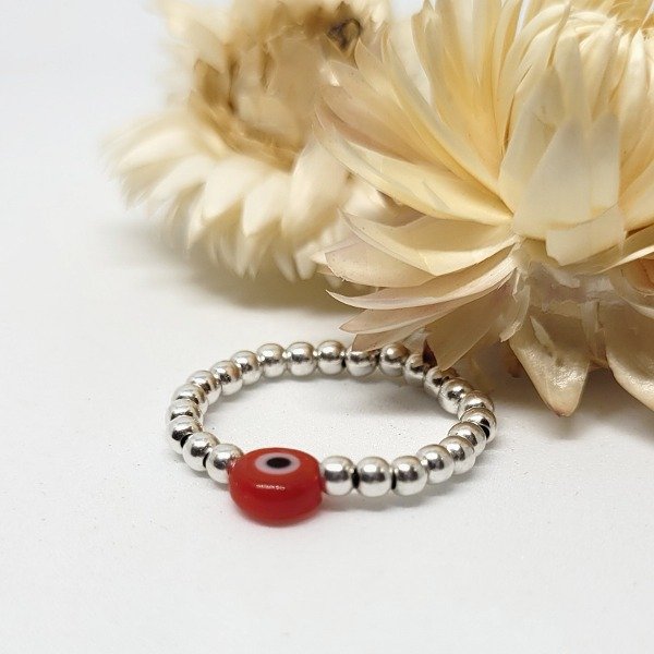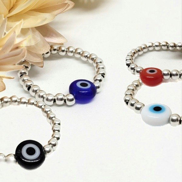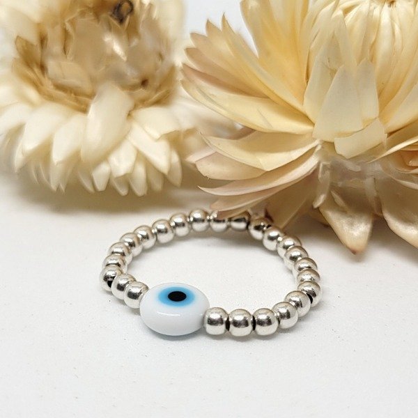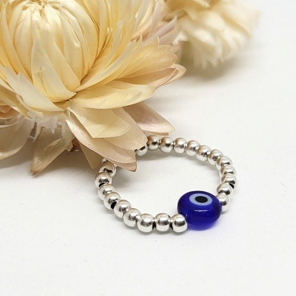 💫Anillo elastizado hecho a mano con bolitas de plata 925 y ojo turco de vidrio