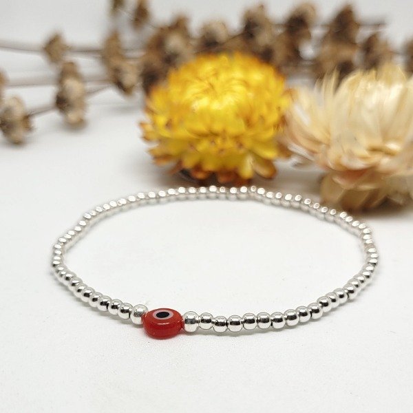 Esta pulsera es elastizada con bolitas de plata y ojito turco de vidrio