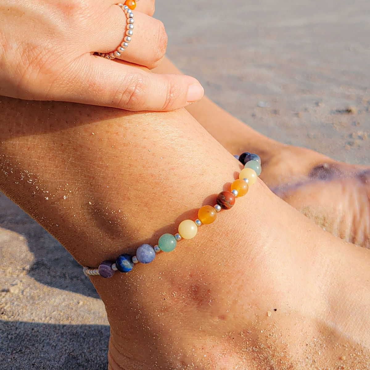 Tobillera de hilo brasilero, piedras naturales y cuentas de plata 925