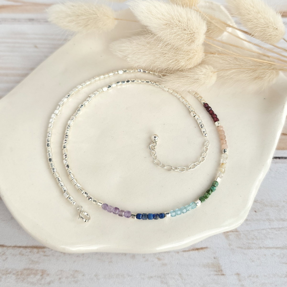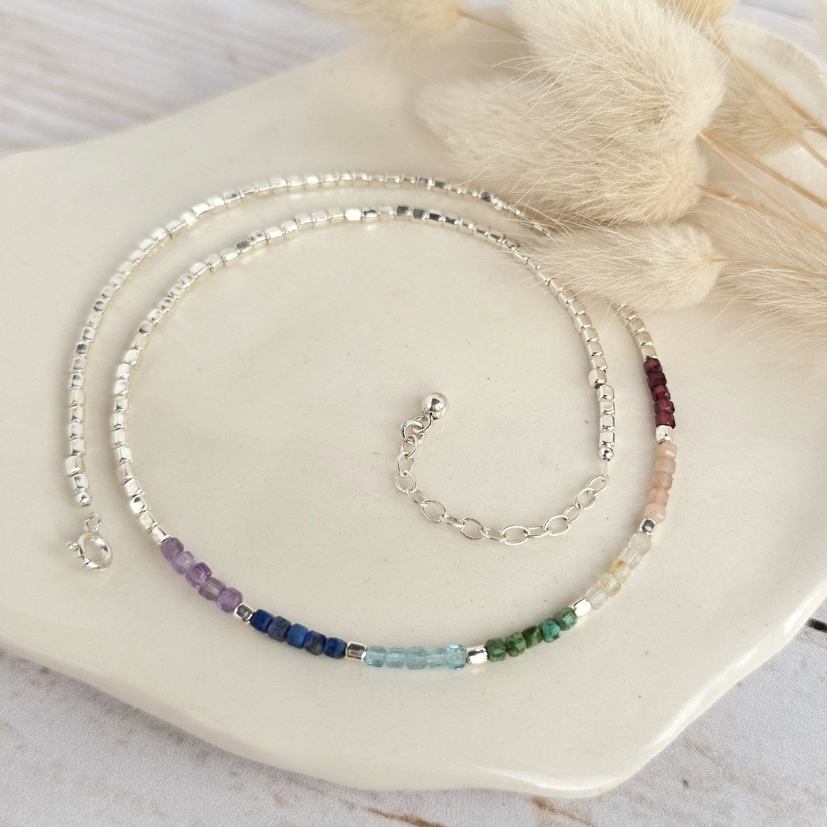 Choker 7 chakras de cubitos de plata 925 y piedras naturales (Granate, piedra solar, citrino turquesa de Hubei, aguamarina, lapislázuli y amatista)