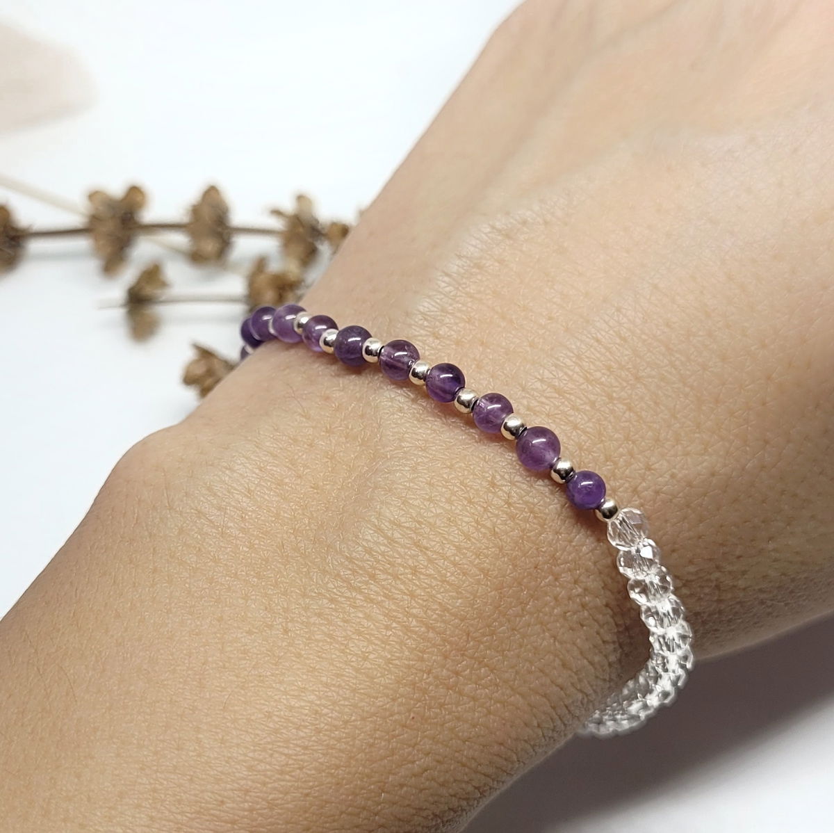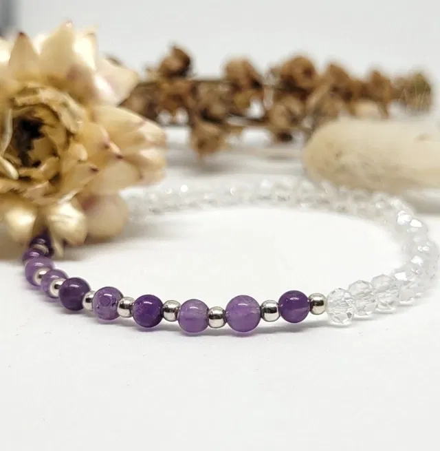 La pulsera Morita está hecha a mano con amatista natural, cuentas de plata y cristal. Es elastizada, cómoda y se adapta fácilmente a tu muñeca.