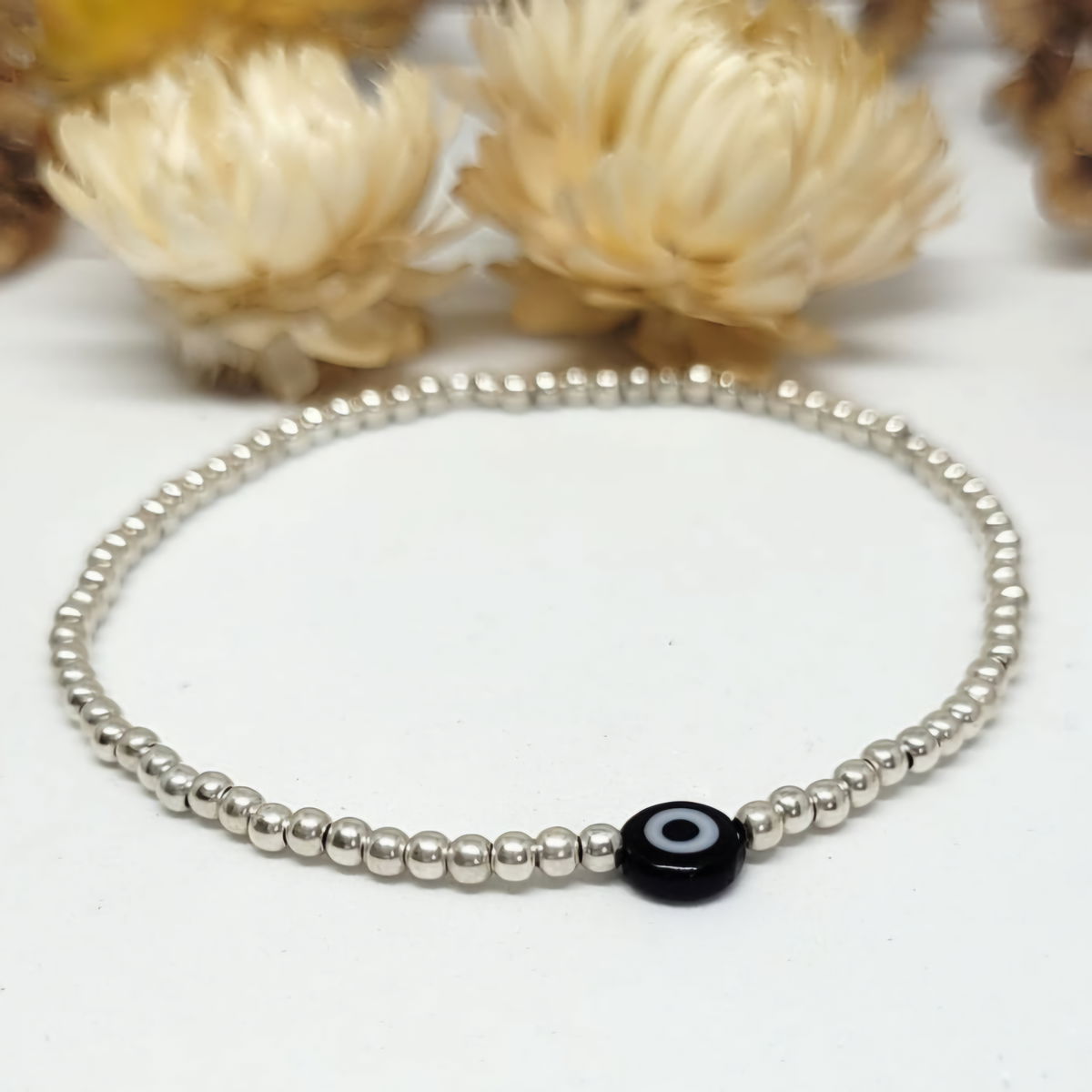 Esta pulsera es elastizada con bolitas de plata y ojito turco de vidrio