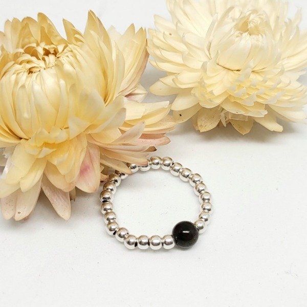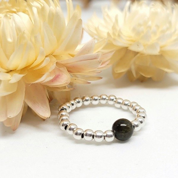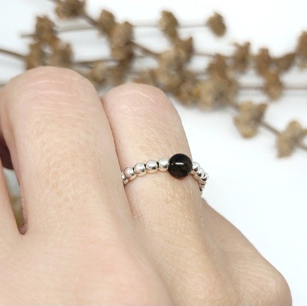 💫Anillo elastizado hecho a mano con bolitas de plata 925 y piedra obsidiana natural