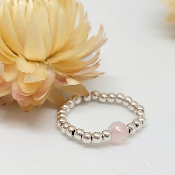 💫Anillo elastizado hecho a mano con bolitas de plata 925 y piedra cuarzo rosa natural