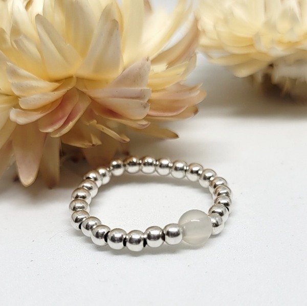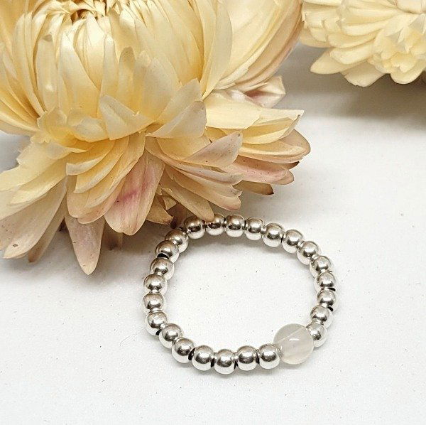 💫Anillo elastizado con bolitas de plata y piedra cuarzo cristal natural.