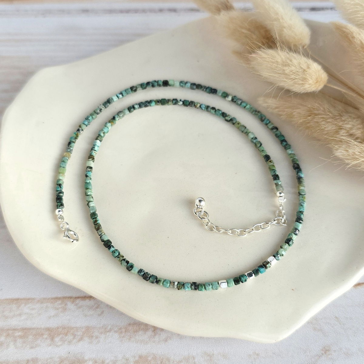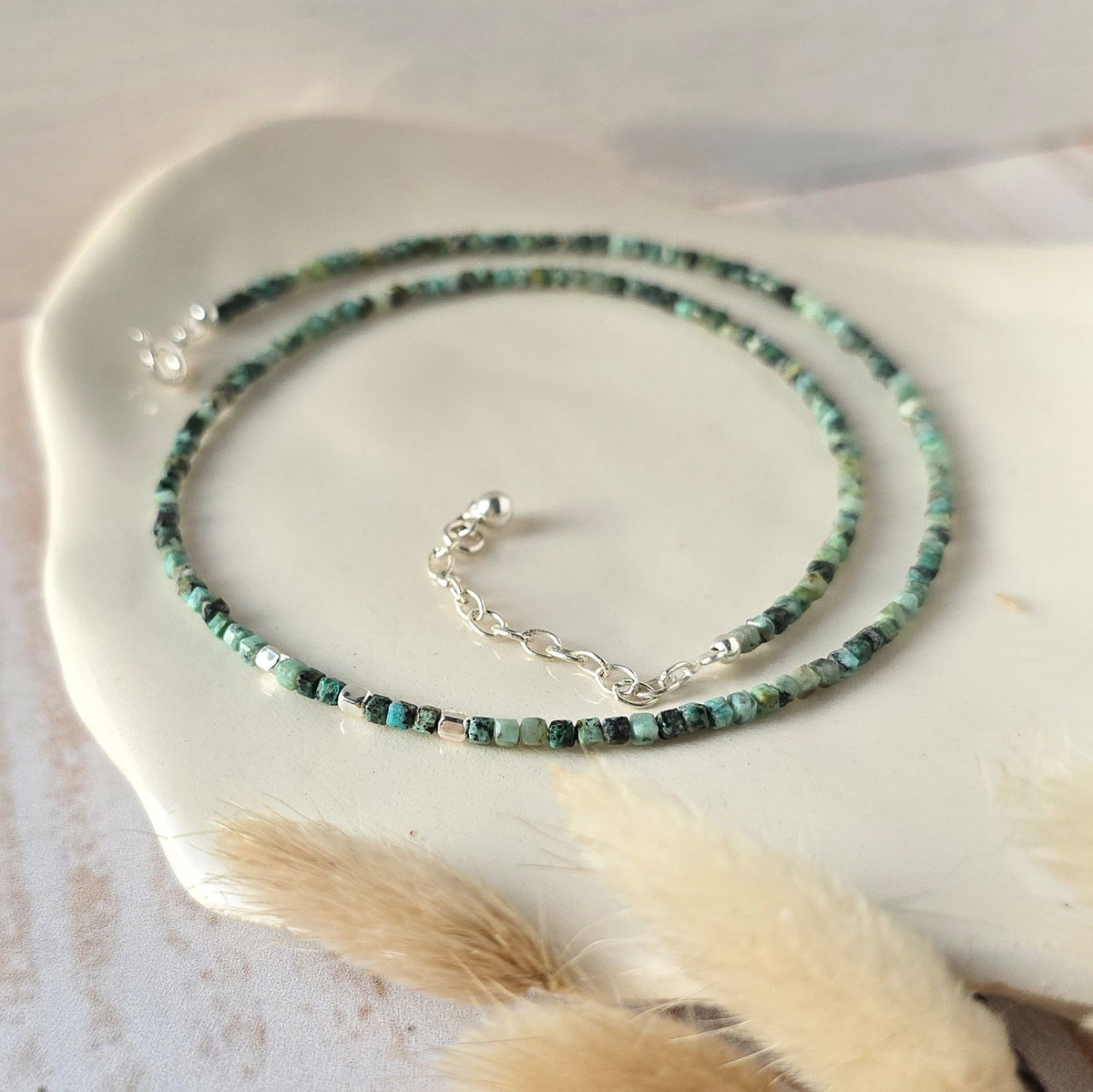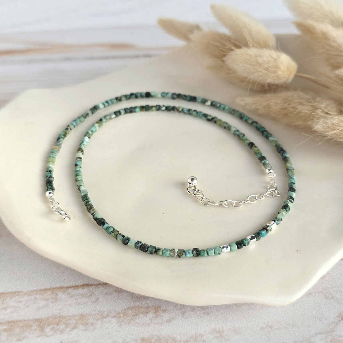 💫Choker hecho con cubitos de piedra turquesa africana (jade)natural y detalles en plata 925