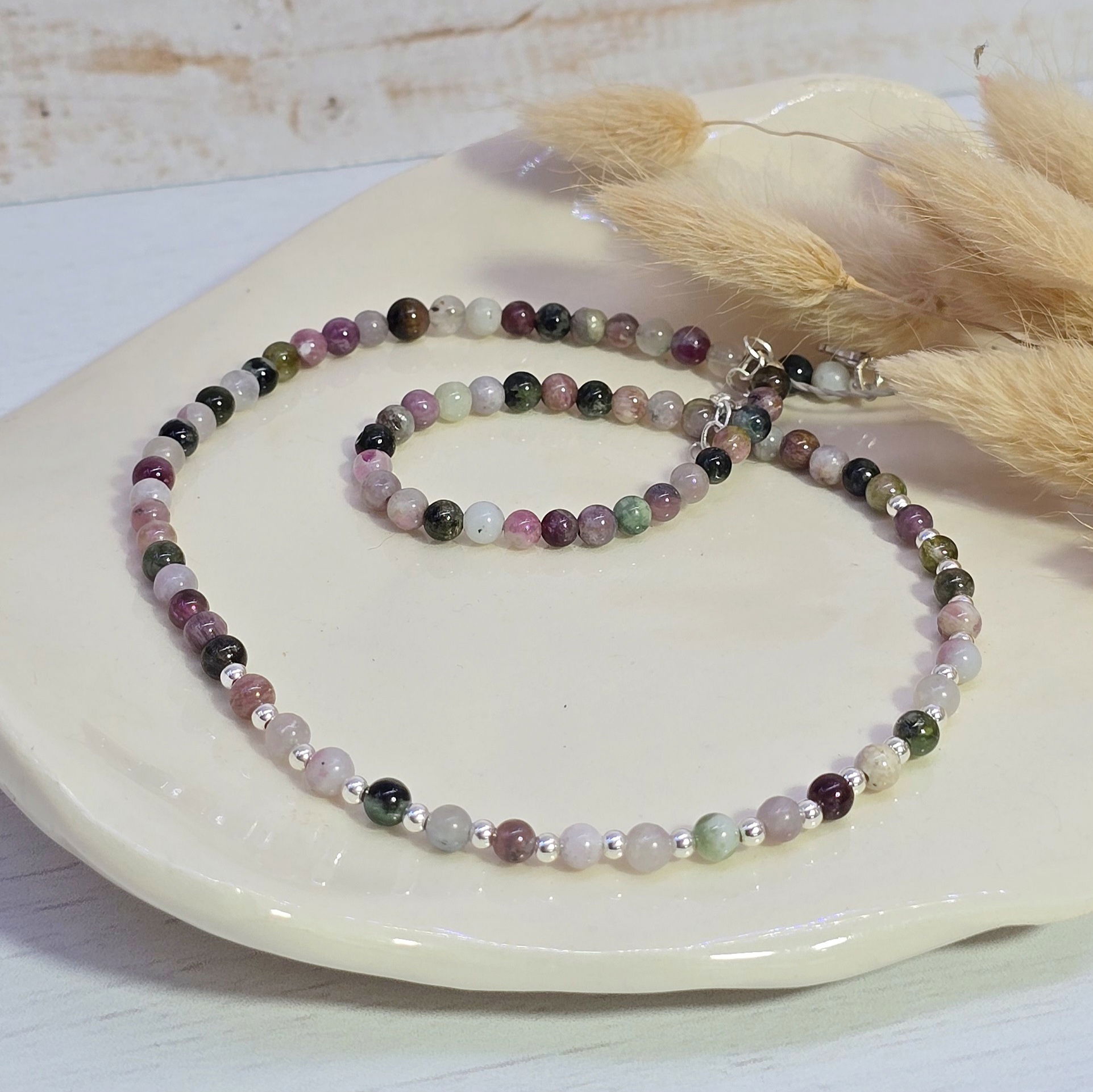 💫Choker hecho con piedra turmalina sandía y en el centro bolitas de plata 925