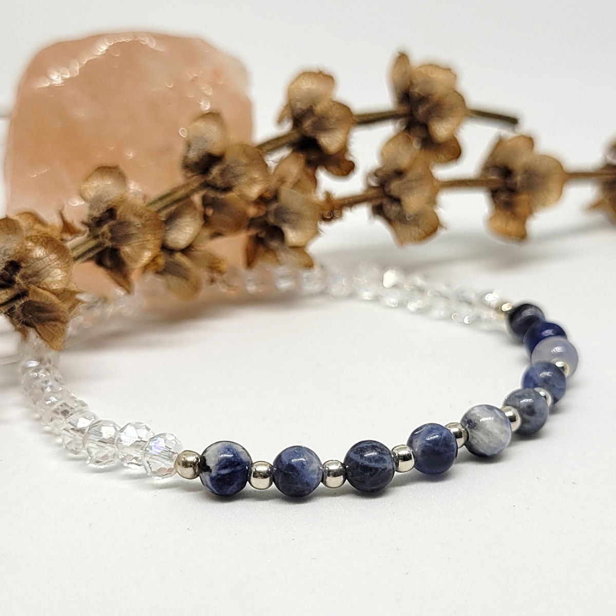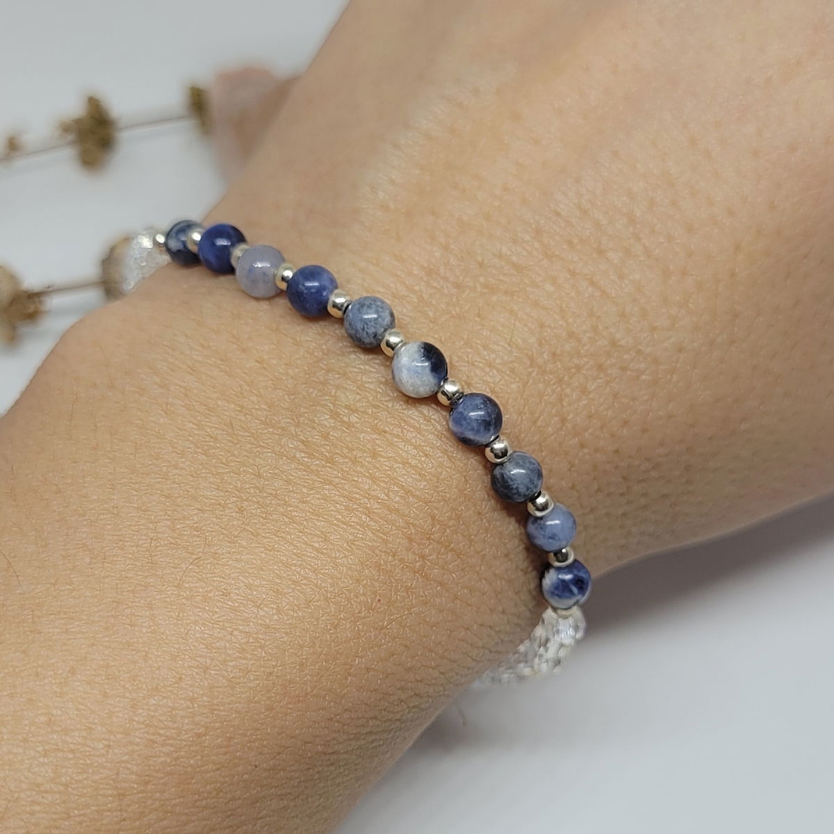 La pulsera Tora está hecha a mano con sodalita natural, cuentas de plata y cristal. Es elastizada, cómoda y se adapta fácilmente a tu muñeca.