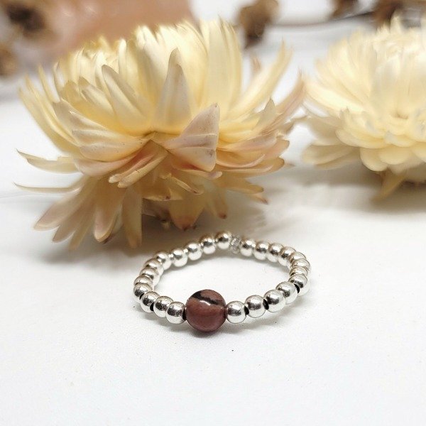 💫Anillo elastizado con bolitas de plata y piedra rodonita natural.