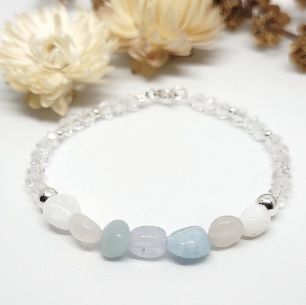 ✨️Pulsera con piedras naturales (piedra luna, aguamarina, ágata celeste y cuarzo rosa), cristal, cuentas y cierre de plata 925