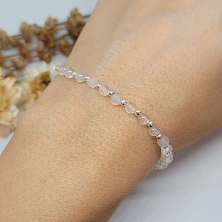 La pulsera Moana está hecha a mano con cuarzo cristal natural, cuentas de plata y cristal.Es elastizada, cómoda y se adapta fácilmente a tu muñeca.