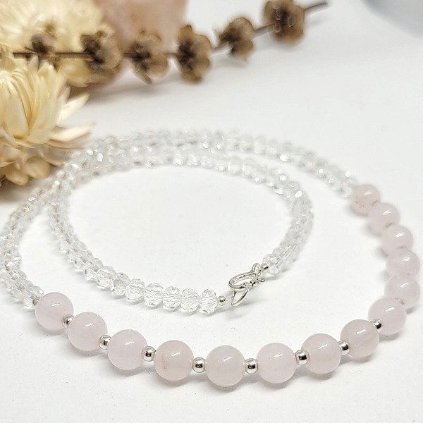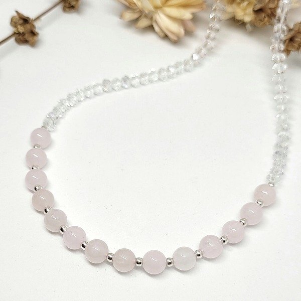 💫Choker con piedra cuarzo rosa natural de 6mm, cuentas de plata y cristal
