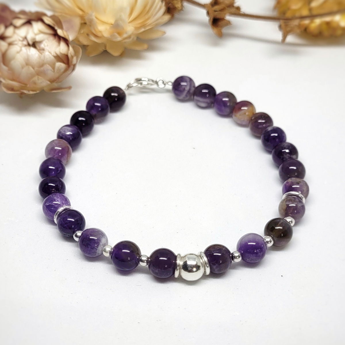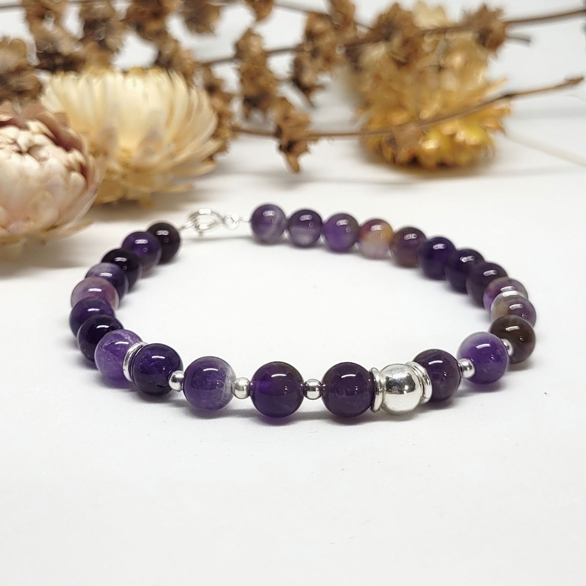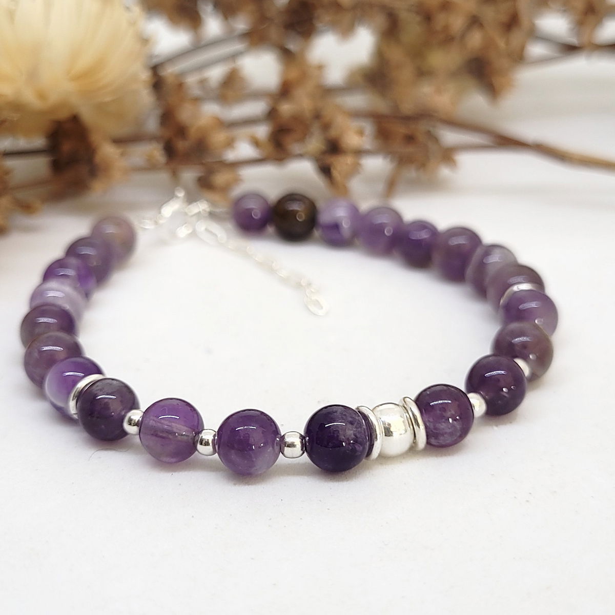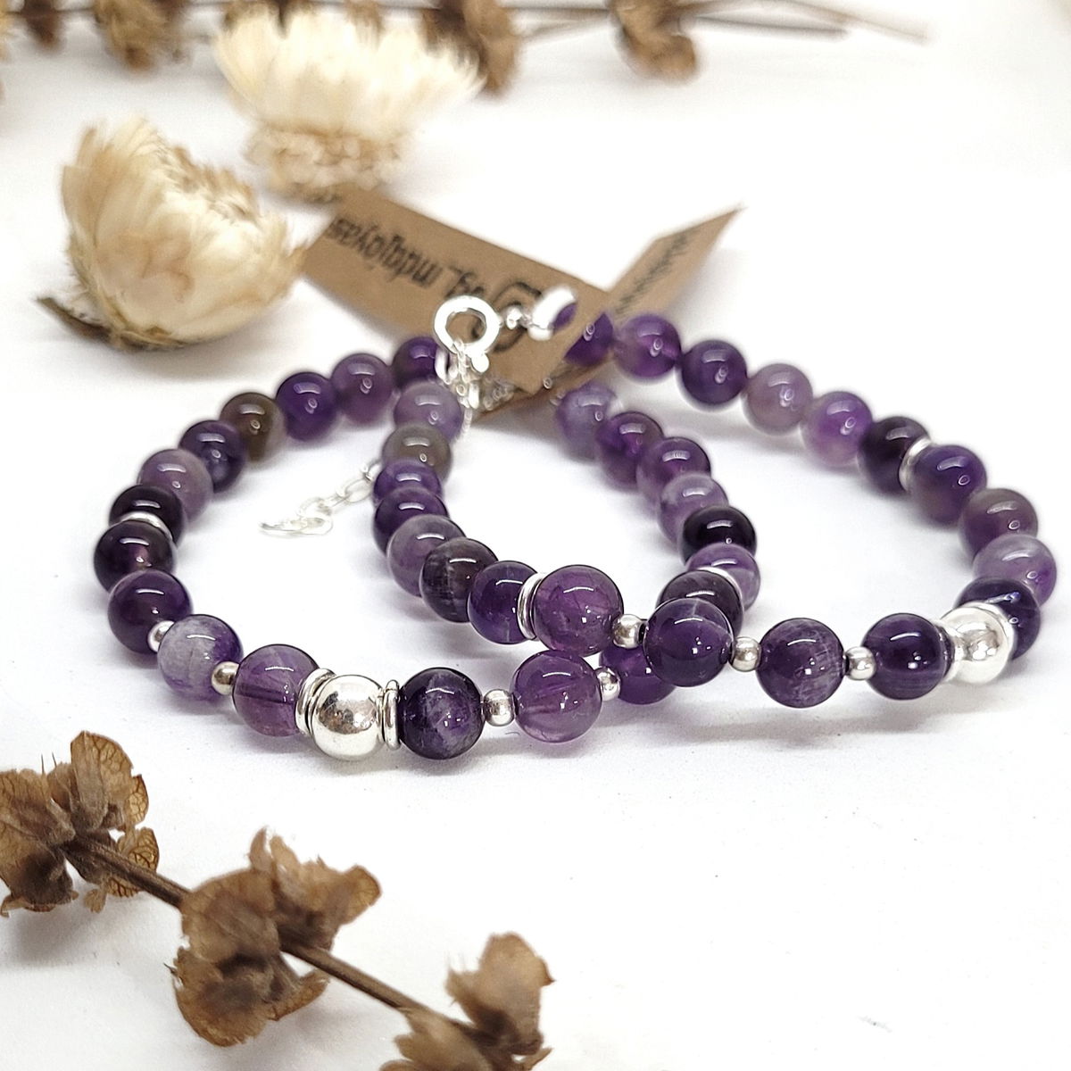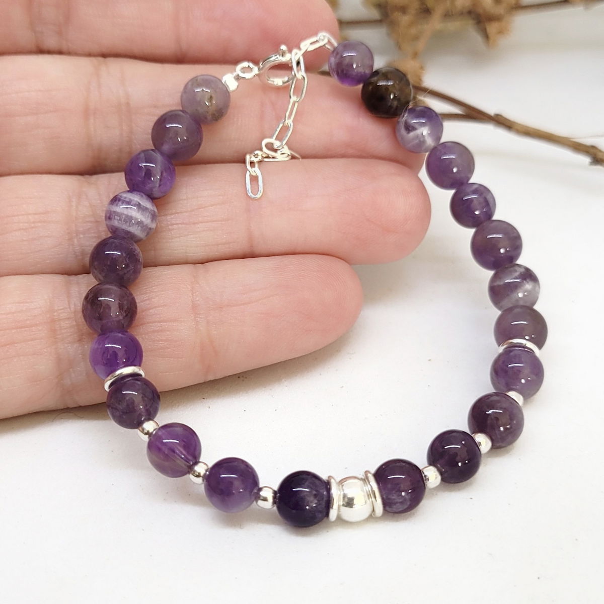 💫Pulsera hecha con piedra amatista natural y cuentas de plata 925