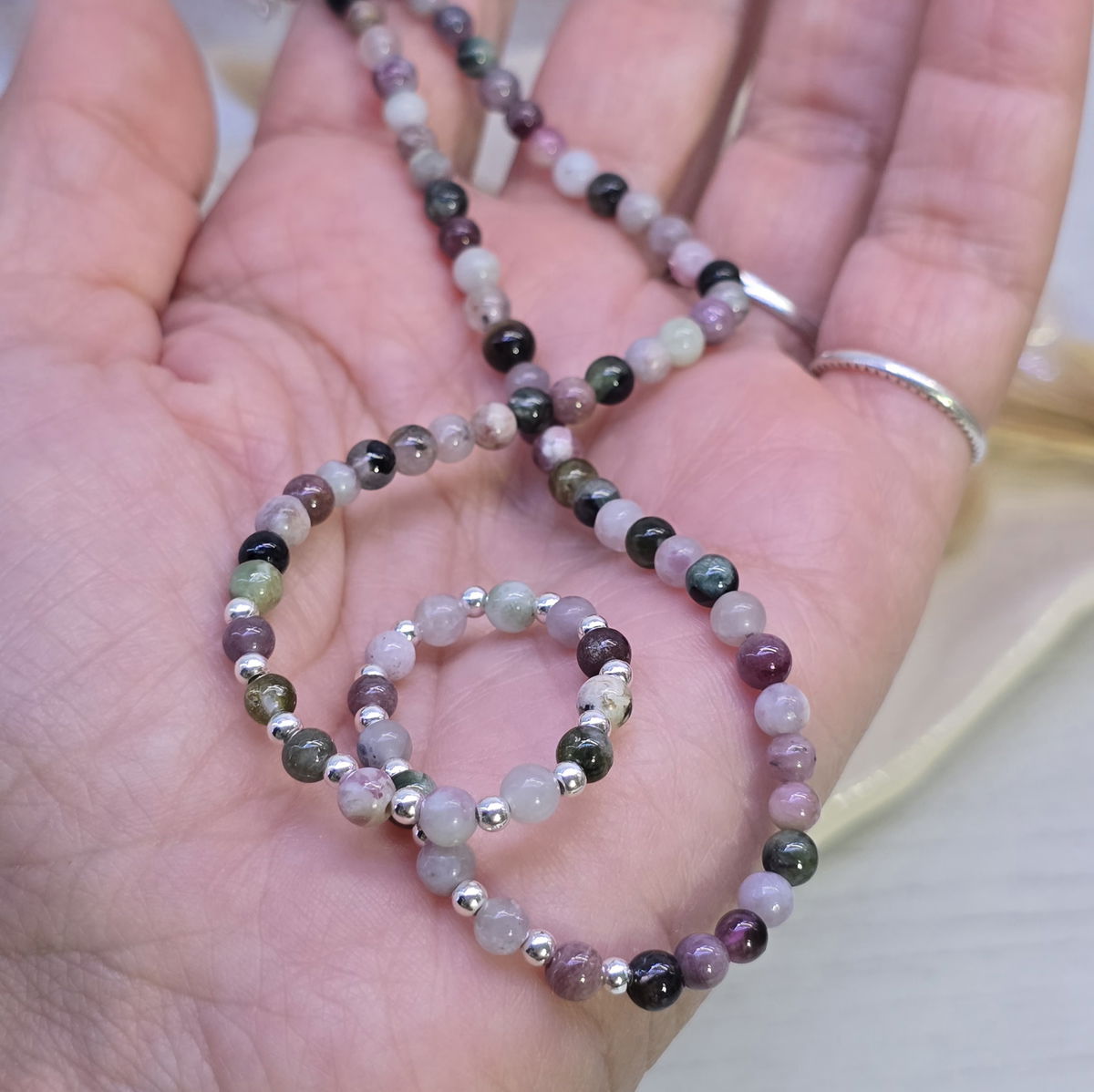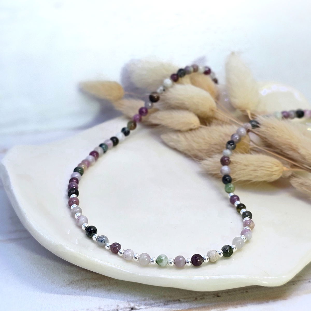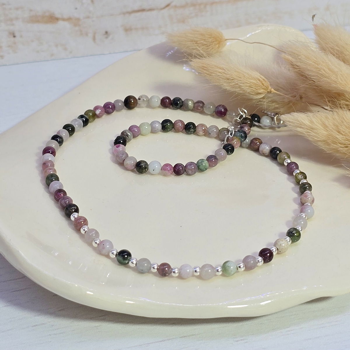 💫Choker hecho con piedra turmalina sandía y en el centro bolitas de plata 925
