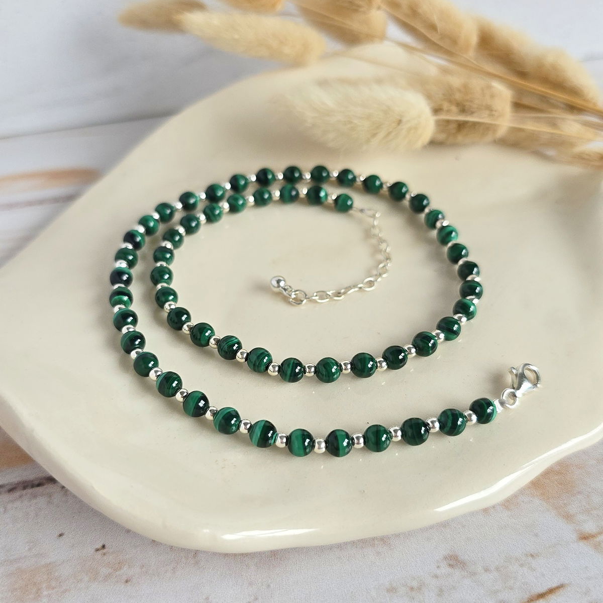 💫Choker con piedra malaquita natural de 4mm y cuentas de plata 925