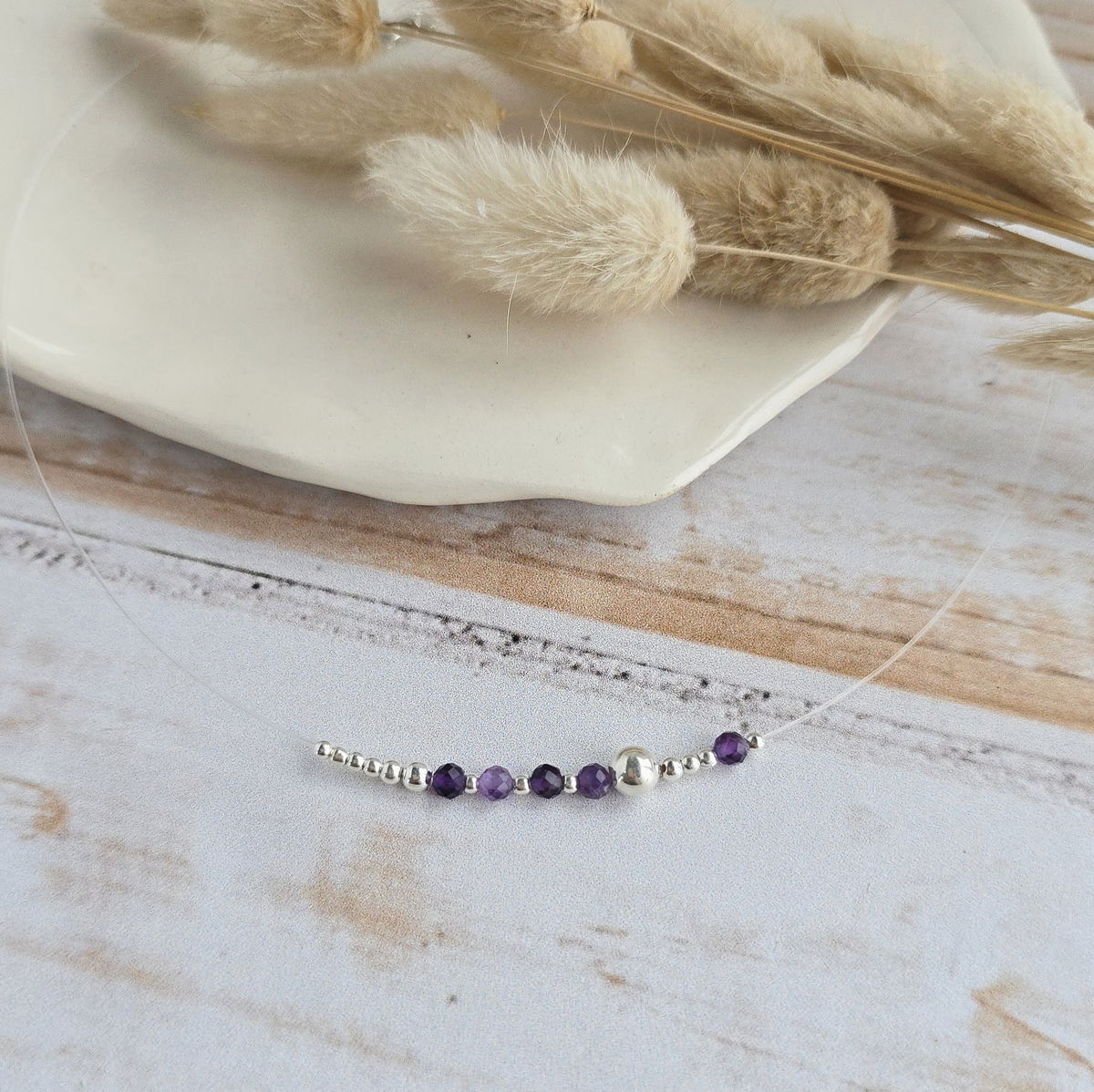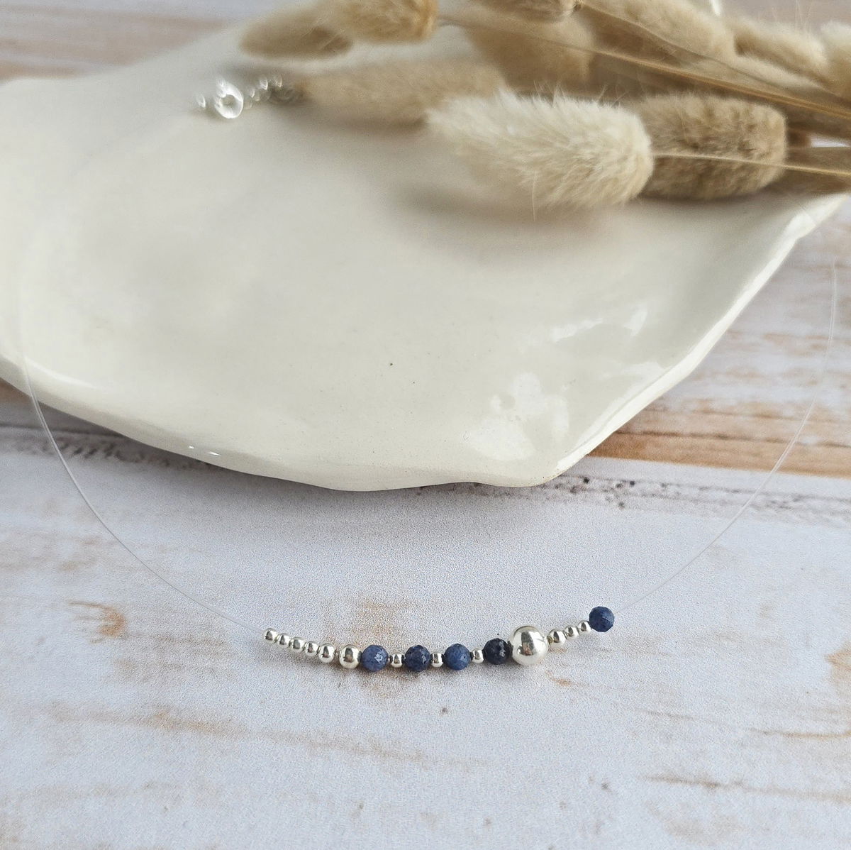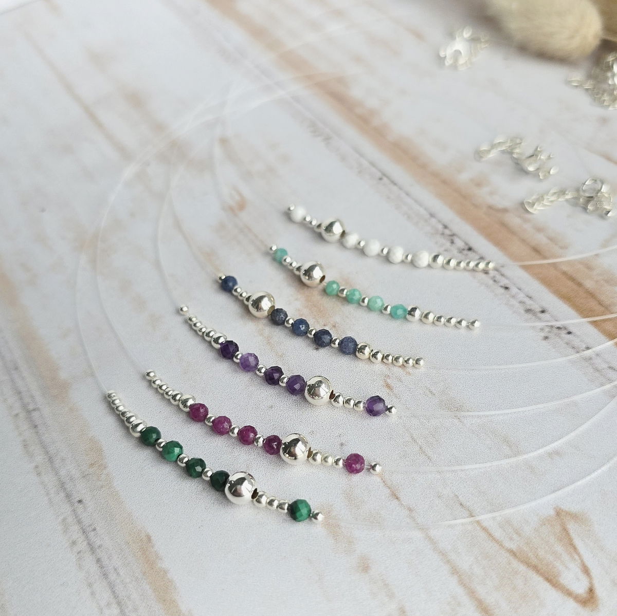 Choker invisible de tanza con cuentas de plata 925 y piedras naturales facetadas.