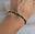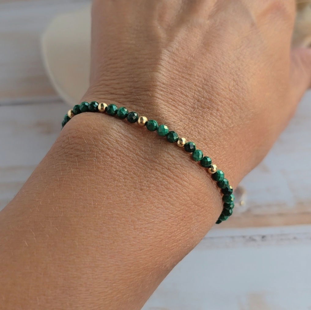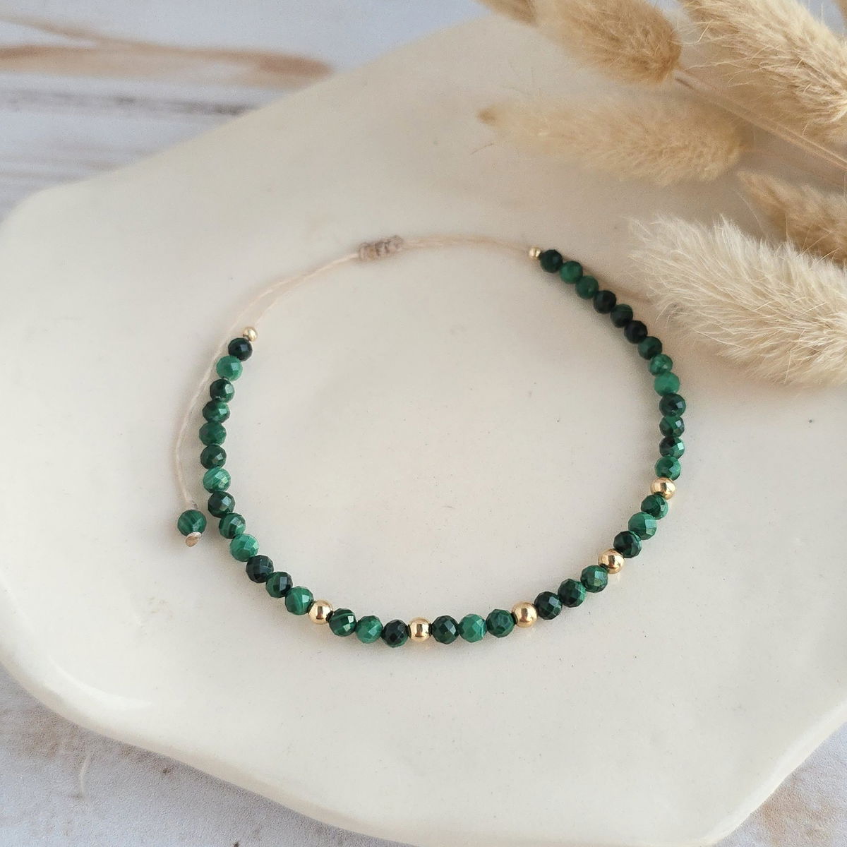 Pulsera hecha con hilo brasilero, cuentas de malaquita natural y bolitas de gold filled