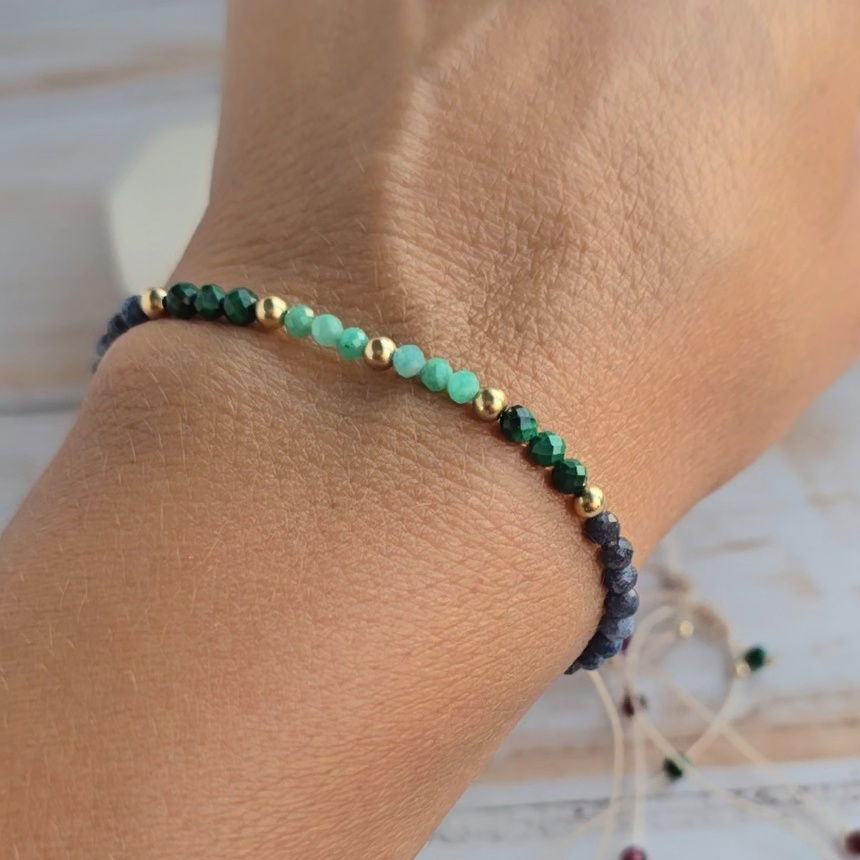 Pulsera hecha con hilo brasilero, cuentas de piedra natural zafiro, malaquita y amazonita y bolitas de gold filled