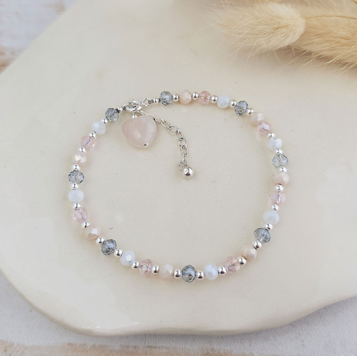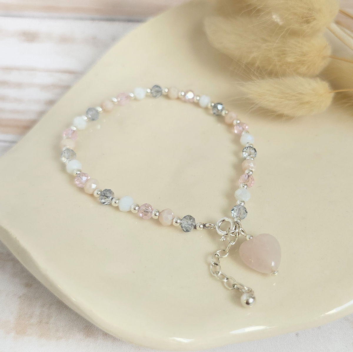 ✨️Pulsera de cristal y bolitas de plata 925 con dije de corazón de cuarzo rosa