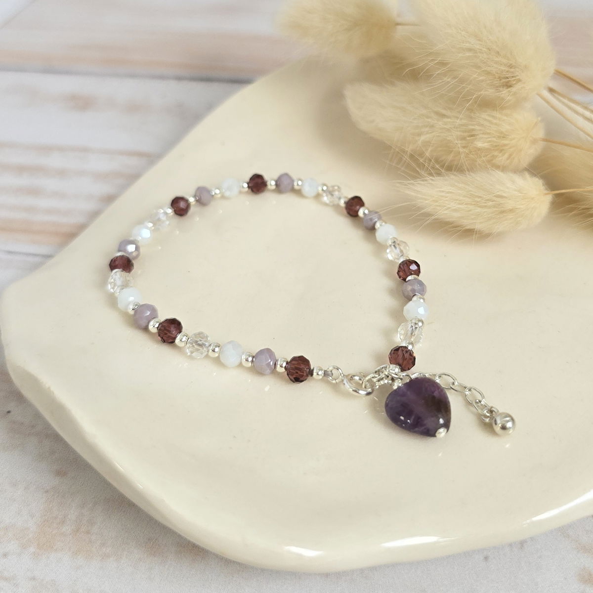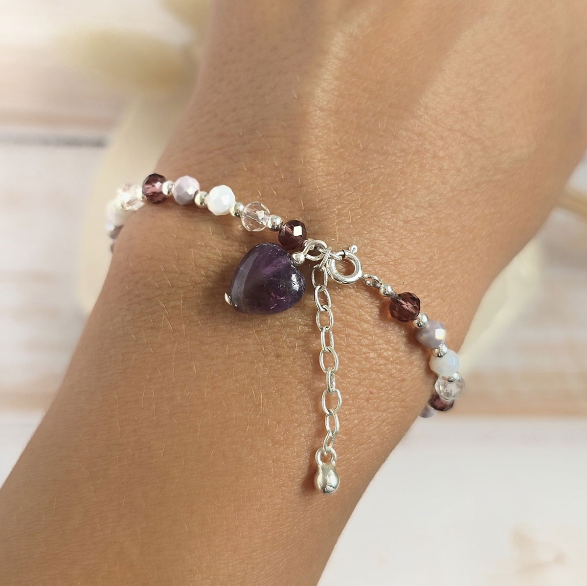 ✨️Pulsera de cristal y bolitas de plata 925 con dije de corazón de piedra Amatista natural